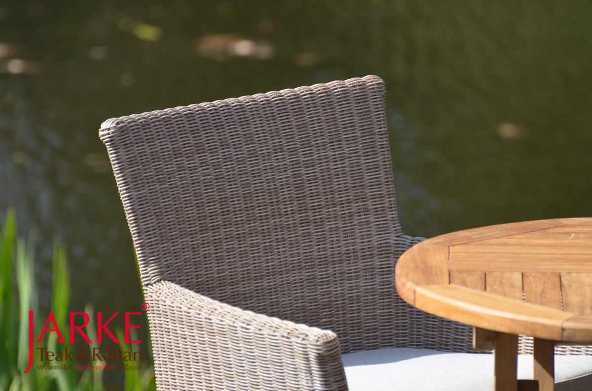 Schön ist der Farbton des Geflechtes „Locost“ – ein Mix aus Grau, Olive und Taupe. Dünn geflochten (round 2,5 mm) für den natürlichen Look. Passt wunderbar zu Teakmöbeln mit grauer Patina. Das Sitzkissen erhalten Sie in der Farbe Hellgrau (leicht meliert) aus dem hochwertigen Outdoor Stoff Olefin, waschbar.