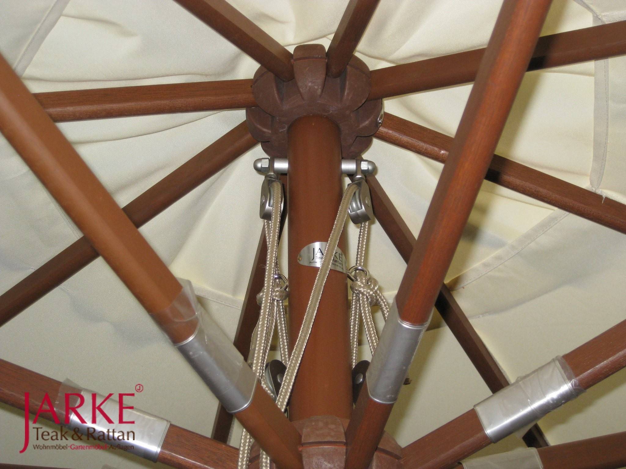 Bitte beachten Sie beim Aufstellen des Schirmes, dass zum Öffnen genügend Raum/ Platz vorhanden ist. Denn dieser muß sich leicht entfalten lassen. Bitte keine unnötige Kraft anwenden, denn dann besteht die Gefahr, dass sich die einzelnen Holzstreben verkeilen und/ oder brechen können. In diesem Fall greifen Sie bitte unter den Schirm, ggfl.s Streben sortieren und das Cover leicht anheben. Erst danach den Flaschenzug zum weiteren Öffnen benutzen.